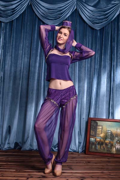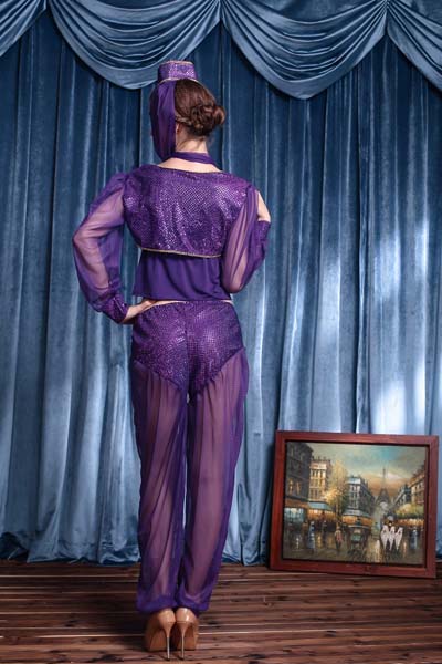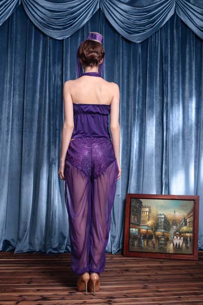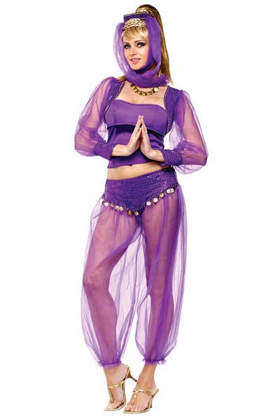 Make every wish come true in this Dreamy Genie costume featuring a fitted purple camisole, bolero jacket, decorative mesh sleeves, matching purple mesh pantaloon pants with gold coin trim, attached purple sequin shorts and a matching hat with an attached veil. (Shoes and necklace not included.)