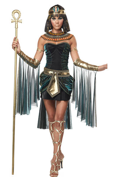 The Egyptian Goddess costume includes a teal and black, ruched side tube dress with peplum detail, metallic gold belt, long mesh train, metallic gold sleeves with long mesh details, collar and head piece.