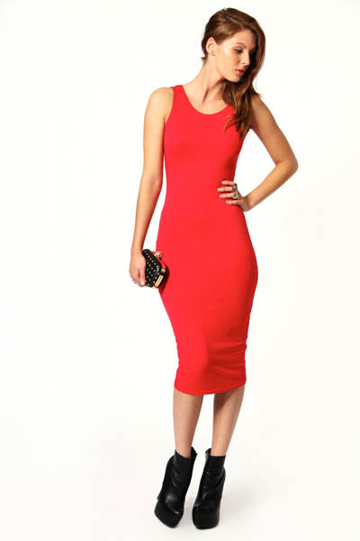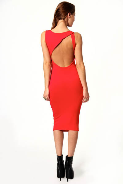 .Midi dresses are a huge trend and super flattering shape, and we’re loving this scoop neck dress with open back