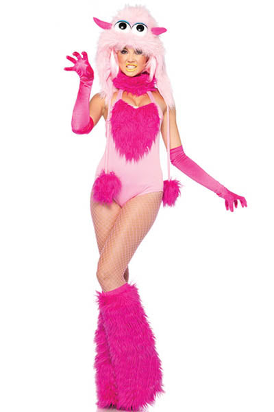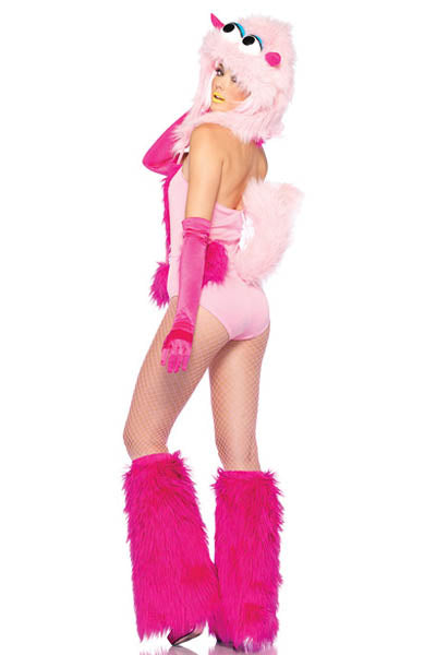 The Furry Cotton Candy Monster costume features a pink romper with hot pink fur front detail with matching neck detail, attached light pink furry tail and a light pink furry monster hood with hot pink pom pom ties,also come legwarmers.