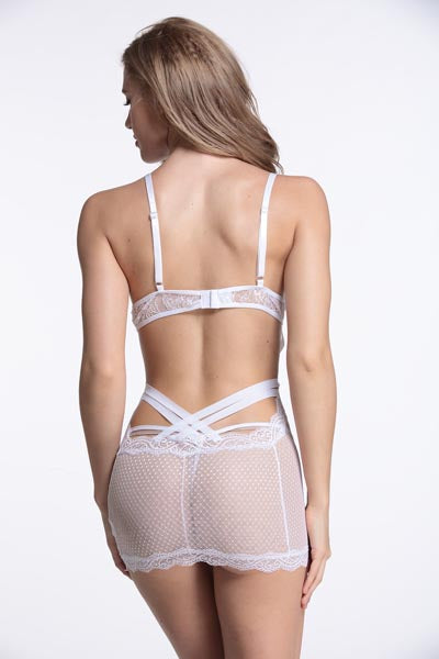 Halter Neck Black Lace Chemise Sexy halter neck chemise with underwire lace and cups, adjustable straps,a center front satin bow and matching panty. (Stocking is not included)