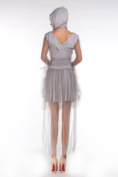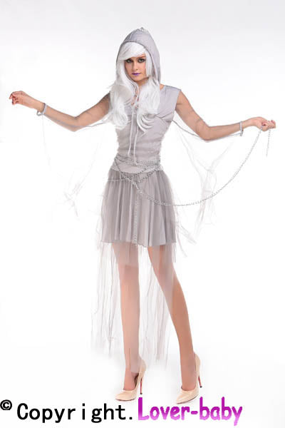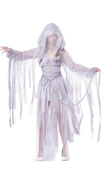 Haunting Beauty Costume Frighten the living in this Haunting Beauty costume featuring a gray tattered dress, gray tattered shrug with attached hood, and silver chains.