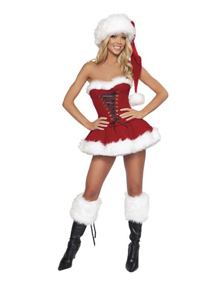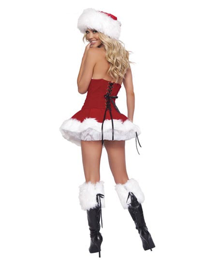 Red velvet, lace-up corset with side zipper and matching, elastic waist skirt with faux fur trim,comes with hat . boot toppers not included.