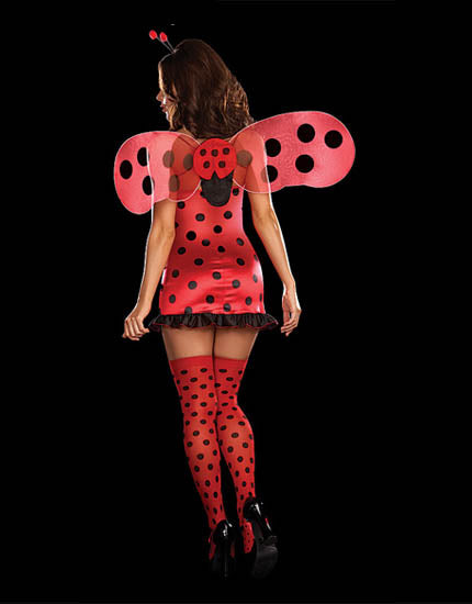Stretch shiny knit polka dot dress with jeweled satin bow detail and sheer ruffle hem. Includes wings, antenna headband . The thigh high stockings not comes .