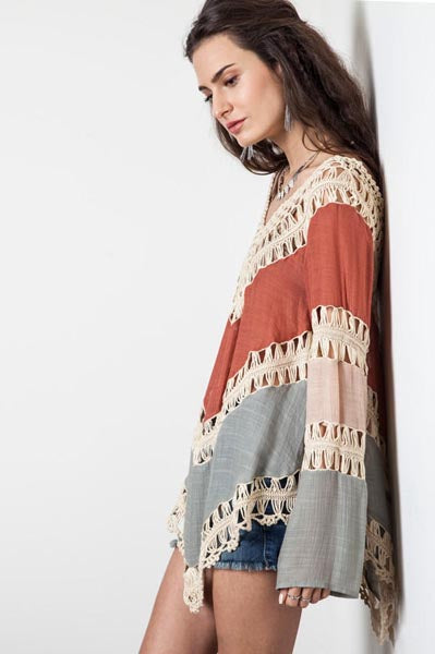 Multicolor Boho V-Neck Long Sleeve Crochet Tunic Top-Rust