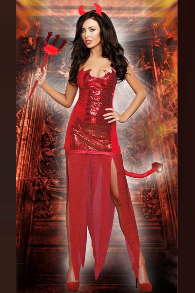 Includes red sequin dress with flame shaped neckline and hidden zipper along the hemline that allows the bottom of the dress to be zipped off for a shorter look. The sheer sparkly flame bottom can be worn as a cape. also includes sequin devil horns and removable tail with sequin heart.