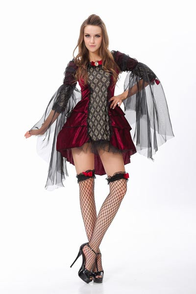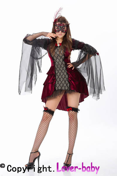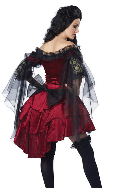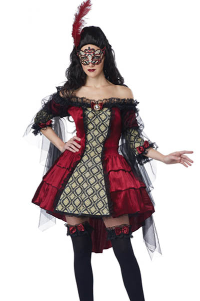 The Mysterious Masquerade costume includes a red, off the shoulder dress with layered skirt, gold brocade front panel, black ruffle trim, oversized back bow, high/low hemline and mask. (Stockings not included.)