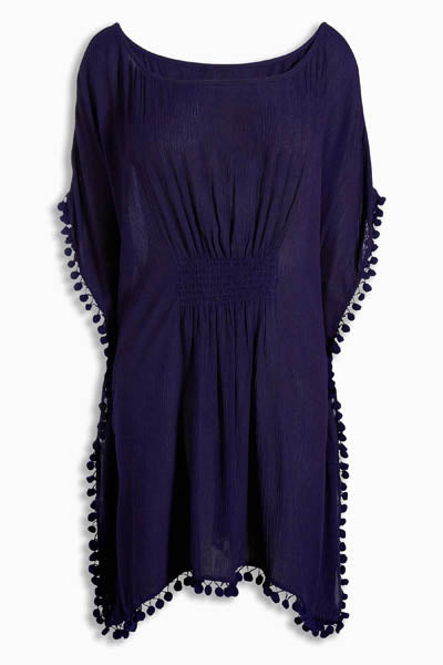 Navy Pom Pom Trim Cinched Waist Chiffon Kaftan