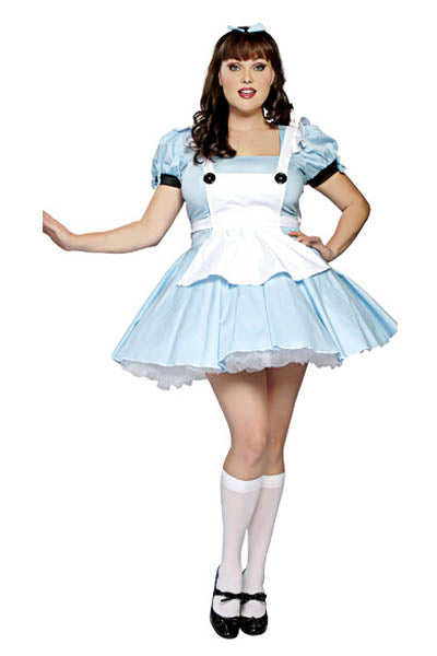 Plus size, Miss Alice sexy, three-piece Halloween costume includes dress, apron with buttons, and headband.