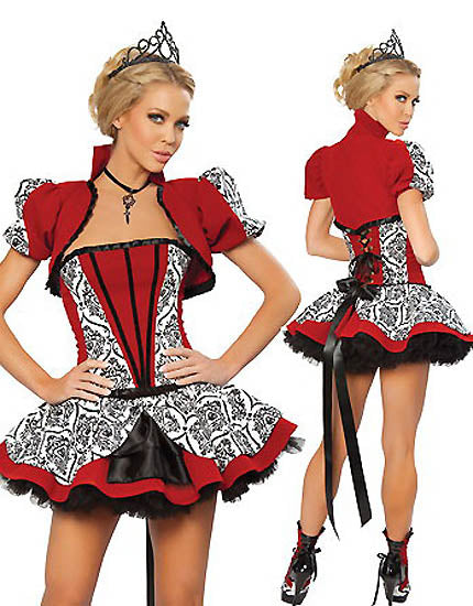 Velvet/Faux Mohair Queen of Hearts Costume includes Lace-up Corset with Boning and Side Zipper, Cropped Jacket and Elastic Waist Skirt with Satin Bow Back.without headdress.