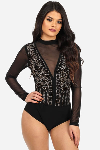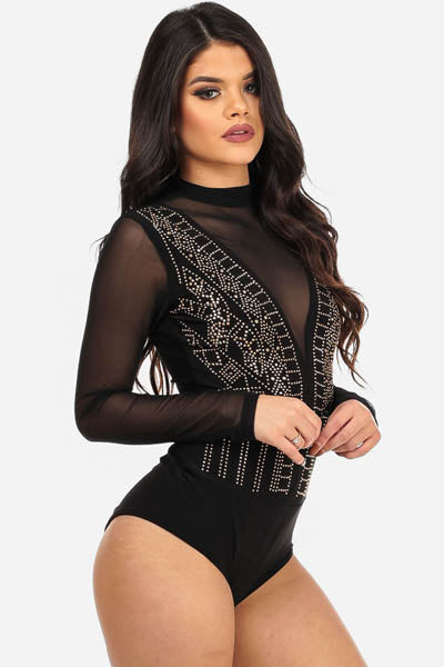 Sexy Black Studded Mesh Long Sleeve Bodysuit